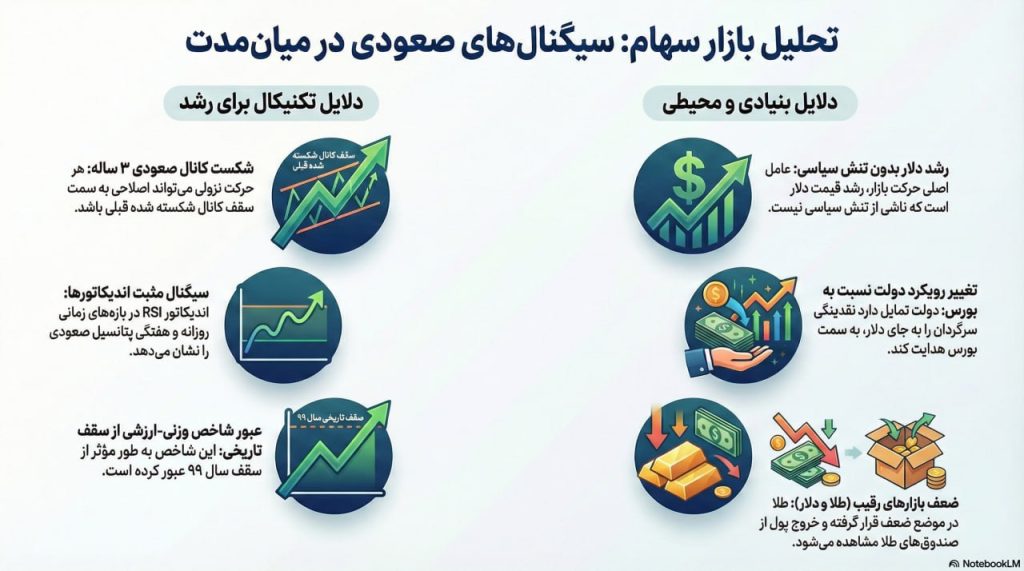 از منظر تکنیکال، یک کانال صعودی کمشیب سهساله در محدوده حوالی ۱٬۵۰۰٬۰۰۰ واحد (مقیاس تاریخی شاخص) شکسته شده است. این شکست بهگونهای ارزیابی میشود که حرکات نزولی احتمالی بازار، بیشتر در قالب اصلاح یا پولبک به سقف کانال شکستهشده باشد و نه آغاز یک روند نزولی جدید.